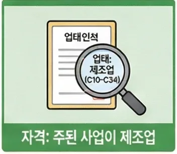 A. 네, 한국표준산업분류 상 제조업(C10-C34)을 주된 사업으로 영위하는 업체만 신청 가능합니다. 사업자등록증의 업태가 제조업이어야 하고, 주 매출이 제조업에서 발생해야 해요.