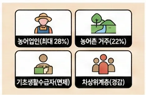 ✅ 농어업인 경감: 최대 28% 지원 (점수 1,800점 이하)