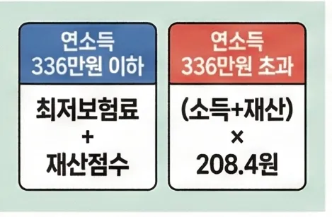 연소득 336만원 이하: 최저보험료 19,780원 + 재산점수