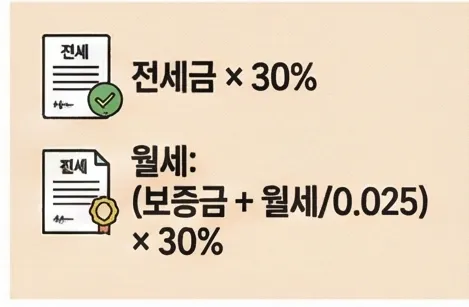 예) 보증금 1억 + 월세 100만원 = (1억 + 4천만원) × 0.3 = 4,200만원